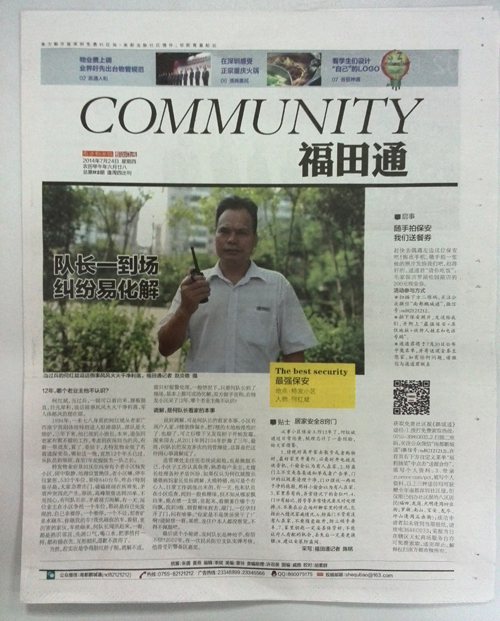 在2014年7月24日《南方都市報(bào)》出版發(fā)行的第92期深圳社區(qū)報(bào)《鵬城通》的“福田通”版中,刊出了“最強(qiáng)保安”的專題報(bào)道,特發(fā)物業(yè)公司特發(fā)小區(qū)管理處保安隊(duì)長(zhǎng)——何紅斌正是這一期報(bào)道的主人公。